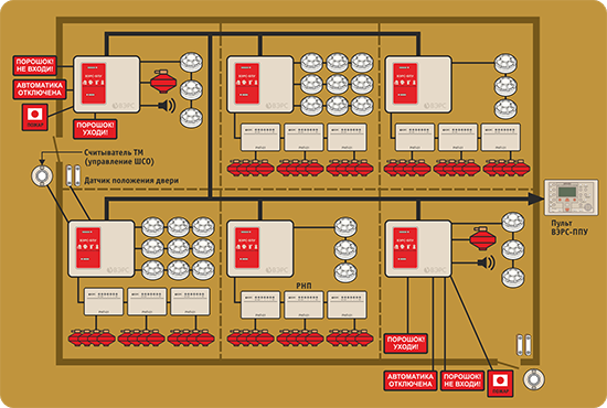 • контролируемой цепи запуска средств пожаротушения (прямым подключением или каскадным, с помощью расширителей ВЭРС-РНП-01).