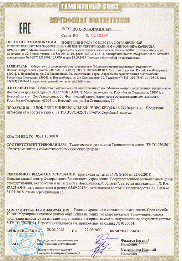 Компанией ВЭРС получен новый сертификат на блоки реле ВЭРС-БРУ(4.8.16.24) версия 3.1.