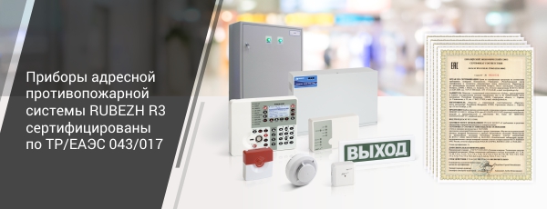 Наш партнер – компания RUBEZH получила сертификат соответствия требованиям ТР ЕАЭС 043/2017  на оборудование адресной противопожарной системы RUBEZH R3