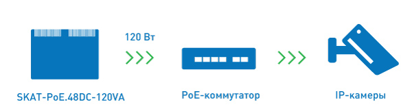 SKAT-PoE.48DC-120VA предназначен для обеспечения бесперебойным электропитанием телекоммуникационного оборудования (коммутаторы, инжекторы) и других устройств поддерживающих технологию Power over Ethernet (PoE) с номинальным напряжением питания 48 В постоянного тока.