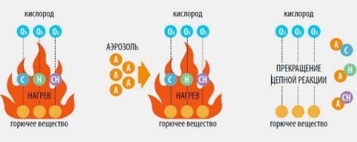 В основе принципа аэрозольного пожаротушения лежит процесс подавления цепных реакций в зоне пламенного горения. За эффективность системы аэрозольного пожаротушения отвечает контроль химических процессов горения: при срабатывании устройства — реагент подавляет цепную реакцию и делает невозможным дальнейшее распространение пламени.