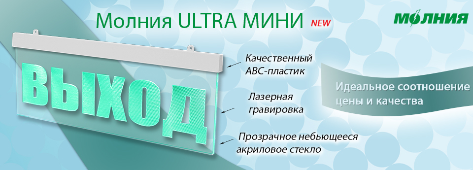 Особенностью  данного  светового табло  являются  уменьшенные габаритные  размеры корпуса, по сравнению с стандартным табло Молния ULTRA. Такой формат оптимален для размещения надписи «Выход».  Компактные габариты позволяют уменьшить себестоимость производства и установить низкую цену на табло. Таким образом, световой указатель Молния ULTRA МИНИ подходит для монтажа на тех объектах, где есть потребность  размещения над выходами  эстетичных прозрачных табло премиум-класса (холлы гостиниц, кинотеатры и др.), при минимальных затратах.   Если требуется другая надпись, то подойдет классическое табло Молния ULTRA