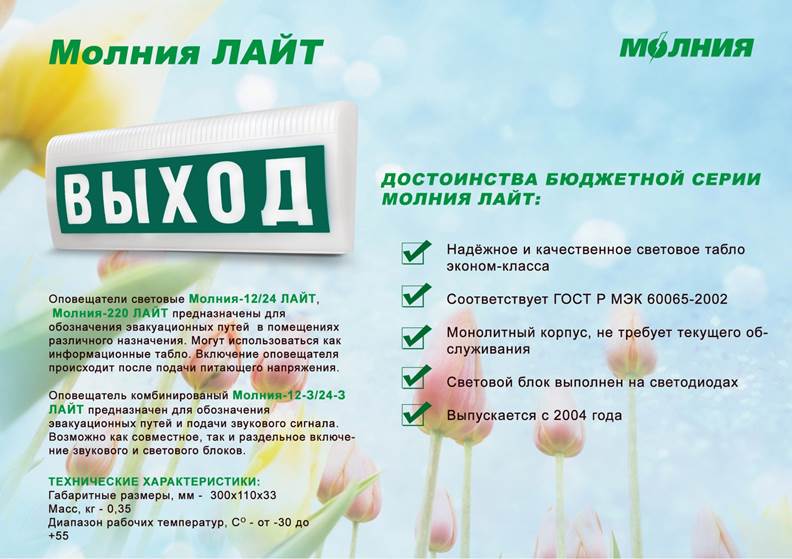 Световые табло  Молния-12/24 ЛАЙТМолния-220 ЛАЙТ, предназначенные для обозначения эвакуационных путей  в помещениях различного назначения, давно зарекомендовали себя на рынке. Могут использоваться как информационные табло.
