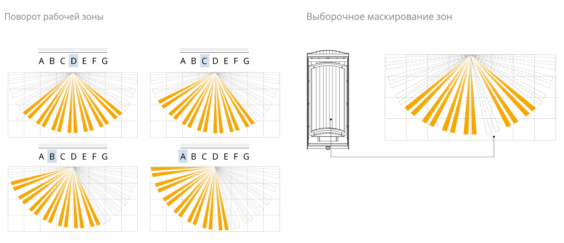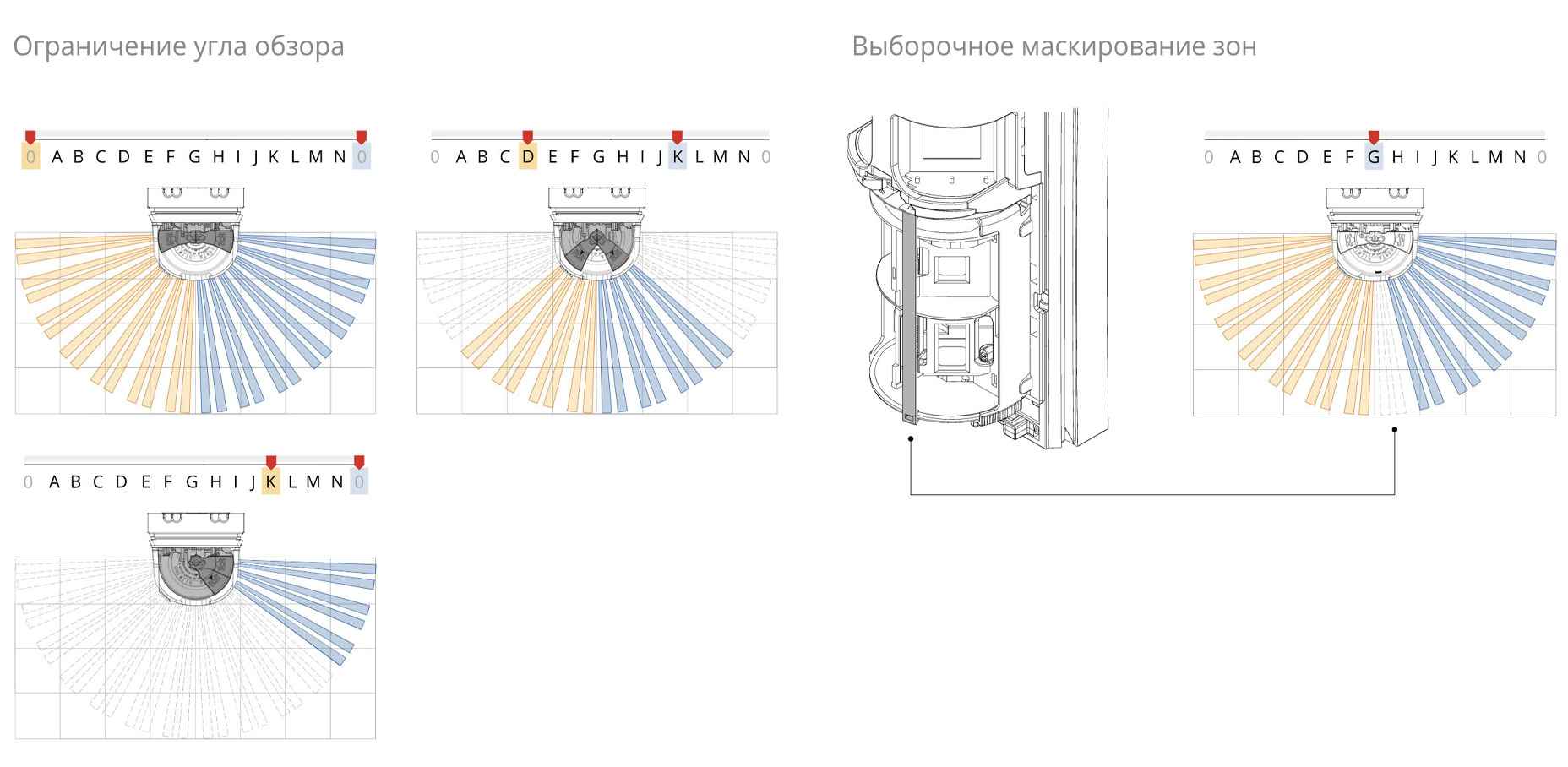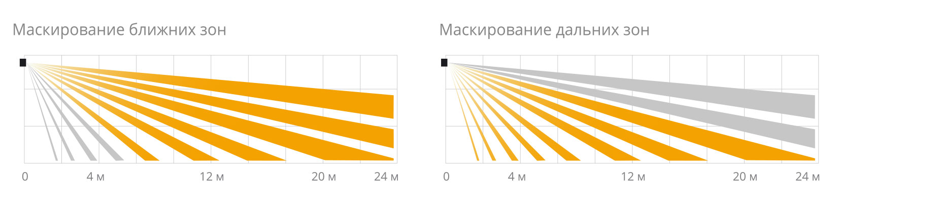 Маскируемые зоны могут располагаться внутри рабочей области обнаружения где угодно: слева, справа или посередине. Чтобы замаскировать зону (т.е. перекрыть поступающее от нее ИК-излучение), используются специальные пластины-наклейки, которые креятся на изнутри на линзу извещателя. В некоторых моделях для этих целей также предусмотрен специальный сдвижной механизм (заслонки).