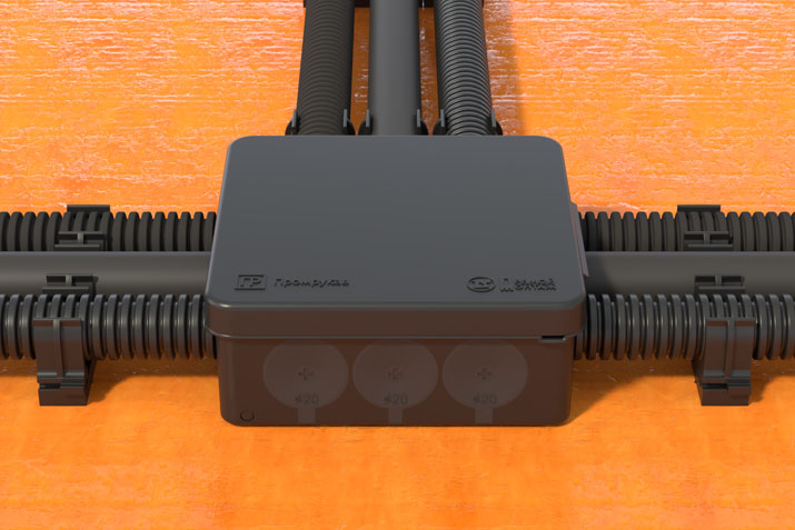 - Монтажные отверстия соосны с клипсам для монтажного пистолета Промрукав, что обеспечивает идеально ровный и эстетичный ввод труб в корпус коробки;