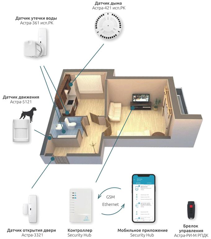 Представляем Вам типовое предложение для автономной охраны 1-комнатной квартиры с использованием беспроводных датчиков, контроллера Security Hub и смартфона.