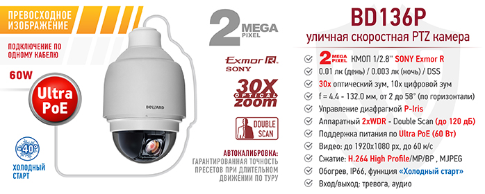 Новая уличная PTZ-камера BEWARD BD136P отличается сверхчувствительным FullHD сенсором SONY Exmor R, аппаратным 2xWDR, мощной оптикой с поддержкой P-Iris, превосходной точностью позиционирования, а также подключением по UltraPoE (60 Вт), системой обогрева и функцией «холодный старт».