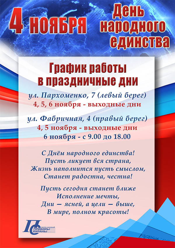 Поздравляем с Днем народного единства! График работы на ноябрь 2017г.