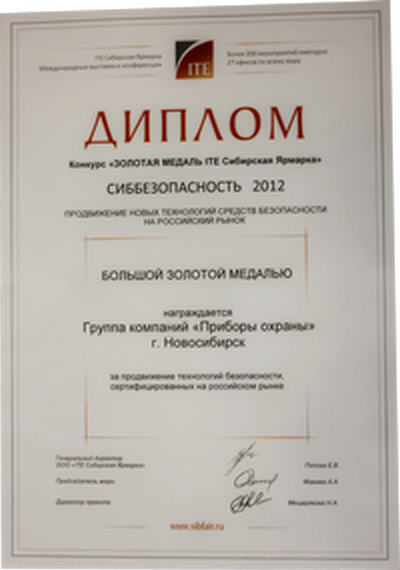 Приятным результатом трехдневной выставки стало получение БОЛЬШОЙ ЗОЛОТОЙ МЕДАЛИ в номинации "Продвижение новых технолоий средств безопасности на российский рынок" во время участия в конкурсе "ЗОЛОТАЯ МЕДАЛЬ ITE Сибирская ярмарка".