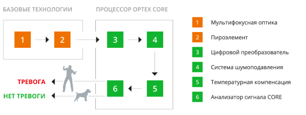 Работа процессора CORE основана на алгоритмах логического сравнения сигналов от различных источников ИК-излучения. Анализируя полученные данные и сравнивая их с хранящимися в памяти библиотеками образцов, процессор принимает решение о том, может ли источником этого сигнала быть реальный нарушитель.