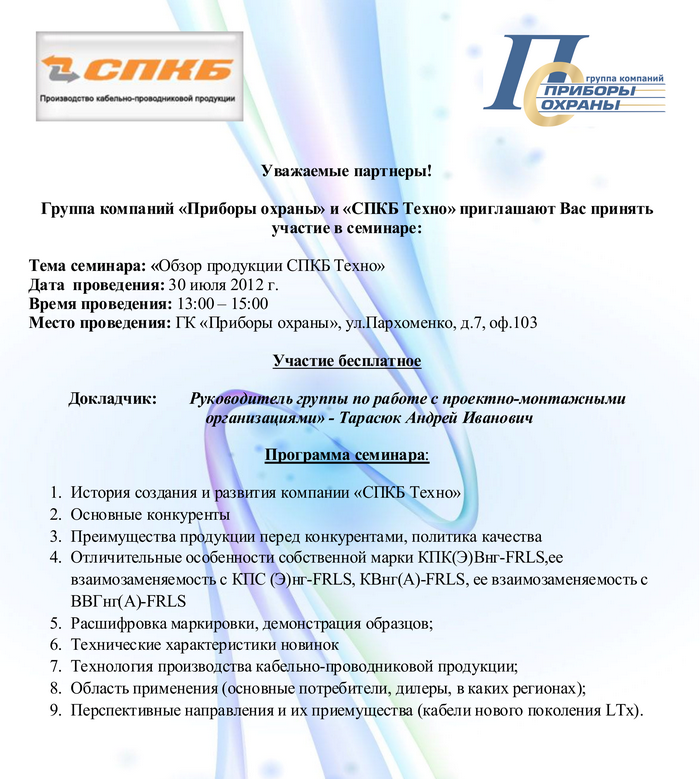 Приглашаем на семинар: "Обзор продукции СПКБ Техно" 30 июля!
