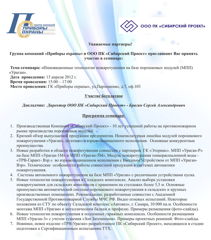 Приглашаем на семинар "Инновационные технологии пожаротушения на базе порошковых модулей (МПП) "Ураган" 13 апреля!